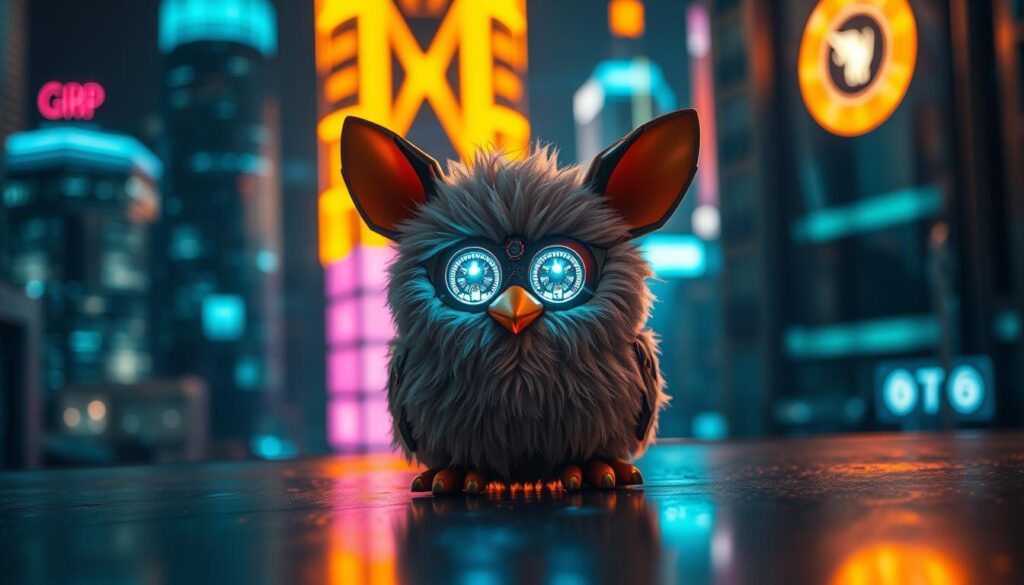 A Furby toy sitting on a metallic surface, illuminated by warm, directional lighting that accentuates its textured fur and intricate mechanical components. The Furby's eyes glow with an intelligent, lifelike expression, conveying a sense of advanced technological sophistication. In the background, a blurred, futuristic cityscape with towering skyscrapers and glowing, neon-lit signage suggests a world of cutting-edge innovation and interconnectivity. The overall scene evokes a sense of wonder and exploration, inviting the viewer to delve deeper into the unique and captivating nature of Furby technology.